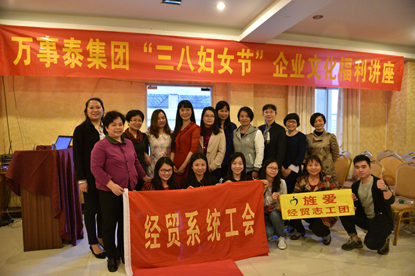 值“三八”婦女節(jié)之際,萬事泰集團(tuán)專門為女員工們舉辦《讓你的工作更完美,家庭更幸福》文化講座。我覺得這次講座十分有意義。講座從如何處理好婚姻家庭關(guān)系、親子關(guān)系到職場(chǎng)壓力排解 等方面進(jìn)行了的講演。不僅提升了女員工自身綜合素質(zhì),也進(jìn)一步增強(qiáng)了企業(yè)的凝聚力和吸引力,希望我縣今后有更多企業(yè)多開展這類有益女職工身心健康、提升自我素質(zhì)的活動(dòng)。