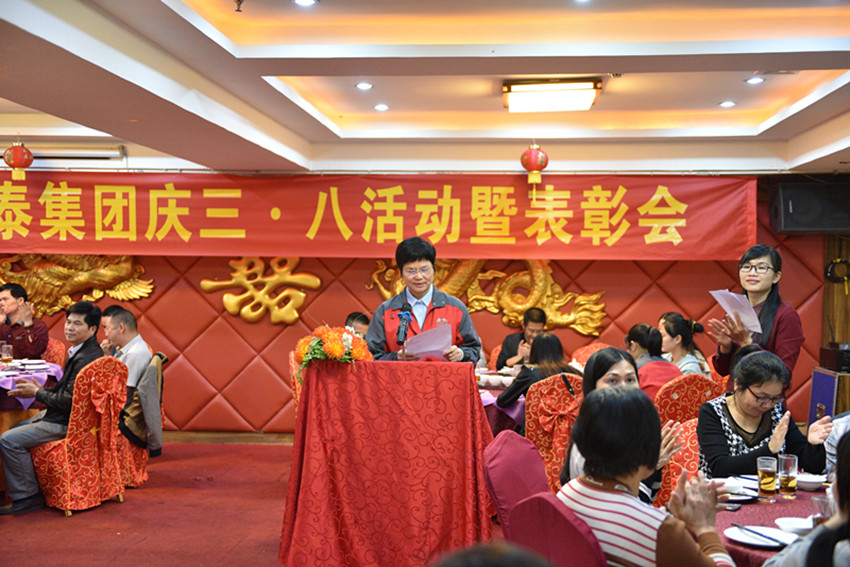 下午6時(shí)許,廣東萬事泰集團(tuán)在南豪酒店2樓宴會(huì)大廳宴開50圍,隆重舉行慶?!叭恕眹H婦女節(jié)活動(dòng)暨表彰大會(huì)活動(dòng)。34名集團(tuán)2015年三八紅旗手接受頒獎(jiǎng)。