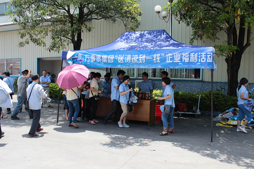 當天下午1時許,集團總部中門、事業(yè)二部門口,兩個藍色的帳篷,“萬事泰集團送清涼到一線企業(yè)福利活動”橫幅醒目顯眼,在高溫天氣里營造了涼爽的氛圍。近5000支不同品類的瓶裝飲料已在冰塊水桶里冰鎮(zhèn)起來,集團訂制的便攜小扇子也整齊擺放,靜候上班的員工到來??偛棉k主任梁賢武、行政部副經(jīng)理陳煥文、工會主席梁洪光等集團管理層親自上陣,為辛苦勤奮的一線員工親自送上一瓶冰鎮(zhèn)飲料,道一聲“您辛苦了,清涼一下!”上班時間一到,一線員工們排成整齊的隊伍領取集團發(fā)放的冰鎮(zhèn)飲料,拿著印有集團品牌和解暑小常識的扇子,開心走向各自的崗位。