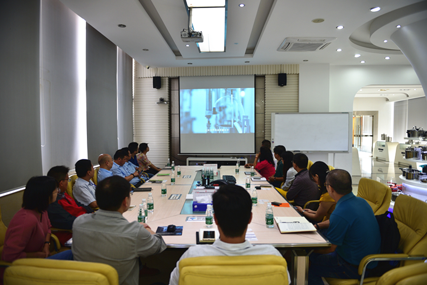 最后,在歐劍華的帶領(lǐng)下,調(diào)研組的領(lǐng)導(dǎo)們與集團技術(shù)中心開發(fā)人員、電器公司技術(shù)開發(fā)人員紛紛入座四樓展廳會議室,一同觀看了萬事泰集團視頻介紹。