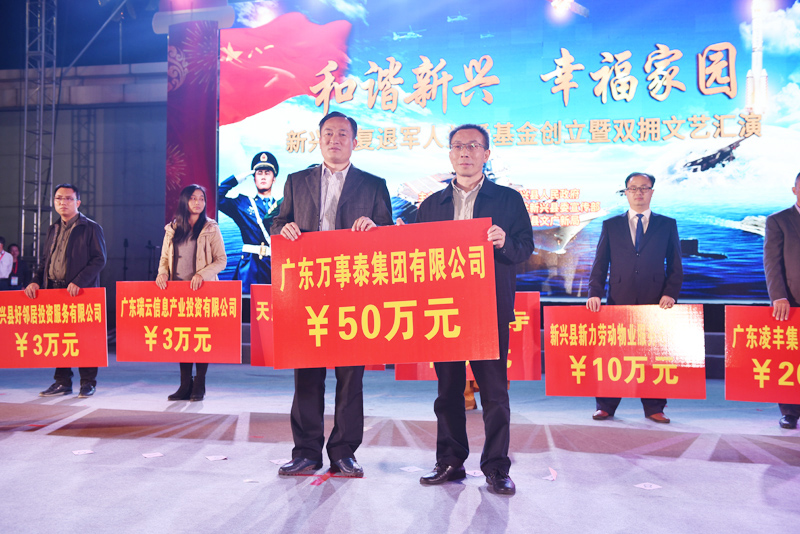 集團(tuán)訊 1月5日晚上,在新興縣文化廣場(chǎng)隆重舉行了新興縣復(fù)退軍人關(guān)愛(ài)基金創(chuàng)立暨雙擁文藝匯演。市委副書(shū)記、政法委書(shū)記袁錦權(quán),市人大常委會(huì)副主任梁錦波,副市長(zhǎng)鐘漢謀、市政協(xié)副主席王莉莉,縣委書(shū)記唐誼,縣委副書(shū)記、縣長(zhǎng)梁子財(cái),縣人大主任梁錦釗,縣政協(xié)主席梁國(guó)華、萬(wàn)事泰集團(tuán)常務(wù)副總裁劉炳耀等愛(ài)心企業(yè)家出席了此次盛會(huì)。