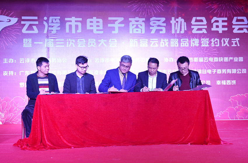 集團(tuán)訊 2017年1月10日下午4時(shí)許,2017云浮市電子商務(wù)協(xié)會(huì)年會(huì)暨一屆三次會(huì)員大會(huì)在云浮市新富云電商快遞家居產(chǎn)業(yè)園內(nèi)日常召開(kāi),同期,并與新富云電商快遞產(chǎn)業(yè)園達(dá)成合作意向,舉辦“新富云戰(zhàn)略品牌簽約儀式”。
