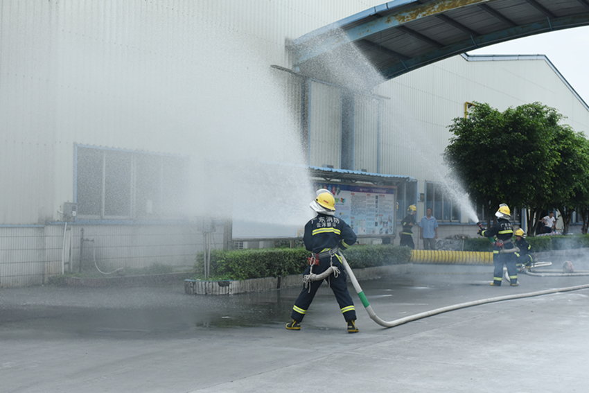 在演習(xí)的過程中,新興縣消防官兵針對火災(zāi)事故發(fā)生時的情況講解了各種滅火器材的性能、用途和使用方法,并實操演習(xí)了車間現(xiàn)場火災(zāi)撲救。隨后,全廠員工在疏散組的指揮下井然有序地按照規(guī)定疏散路線,迅速撤離了現(xiàn)場,到達(dá)指定地點。