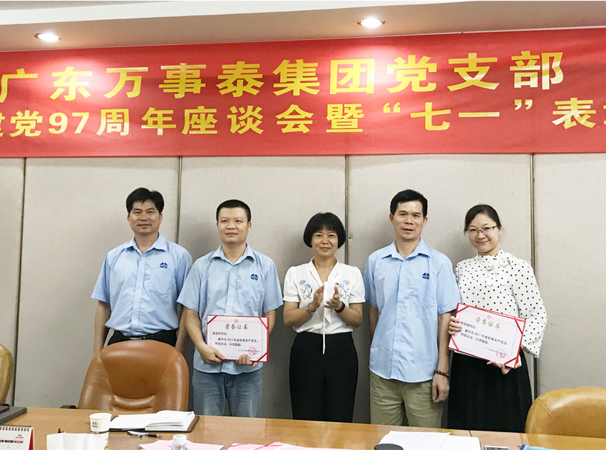 集團(tuán)訊 為慶祝中國(guó)共產(chǎn)黨成立97周年,回顧黨的光輝歷程,繼承和發(fā)揚(yáng)黨的優(yōu)良傳統(tǒng),增強(qiáng)萬(wàn)事泰黨員們的凝聚力和工作積極性,充分發(fā)揮共產(chǎn)黨員的先鋒模范作用 ,6月29日下午,廣東萬(wàn)事泰集團(tuán)黨支部召開紀(jì)念建黨97周年座談會(huì)暨“七一”表彰會(huì)。系統(tǒng)黨委副書記陳婉華參加會(huì)議,并為先進(jìn)基層黨組織和個(gè)人頒獎(jiǎng)。