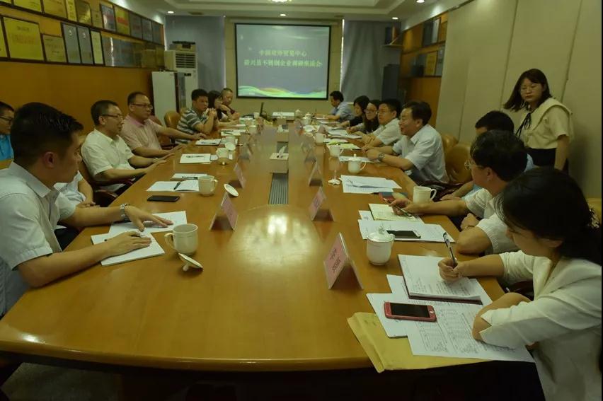 6月24日下午中國對外貿(mào)易中心對新興縣不銹鋼企業(yè)調(diào)研會議在萬事泰集團(tuán)會議室召開。中國對外貿(mào)易中心副主任徐兵一行6人及云浮市副市長施東紅、市商務(wù)局局長陳金進(jìn)等市縣領(lǐng)導(dǎo),萬事泰集團(tuán)常務(wù)副總裁、縣不銹鋼商會會長劉炳耀、總裁辦主任梁賢武等集團(tuán)領(lǐng)導(dǎo)共同參加了這次會議。會議由云浮市商務(wù)局局長陳金進(jìn)主持。