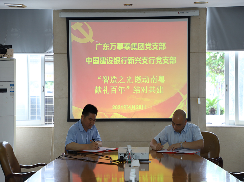 集團(tuán)訊 4月28日上午,建設(shè)銀行新興支行黨支部書記羅國(guó)良帶領(lǐng)其黨支部黨員代表到萬事泰集團(tuán)開展黨建結(jié)對(duì)共建活動(dòng)和簽約儀式,萬事泰集團(tuán)黨支部書記梁洪光、行政部總監(jiān)陳永錦以及黨員代表10余人參加活動(dòng)儀式。在活動(dòng)儀式上,建行黨支部書記羅國(guó)良與萬事泰集團(tuán)黨支部書記梁洪光續(xù)簽結(jié)對(duì)共建協(xié)議書。三年前建設(shè)銀行新興支行黨支部與萬事泰集團(tuán)黨支部已經(jīng)簽訂黨建結(jié)對(duì)共建協(xié)議書,今年期滿繼續(xù)簽訂。