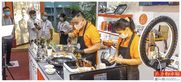 廚具參展商在展位現(xiàn)場直播用自家廚具做菜。 南都記者 譚慶駒 攝