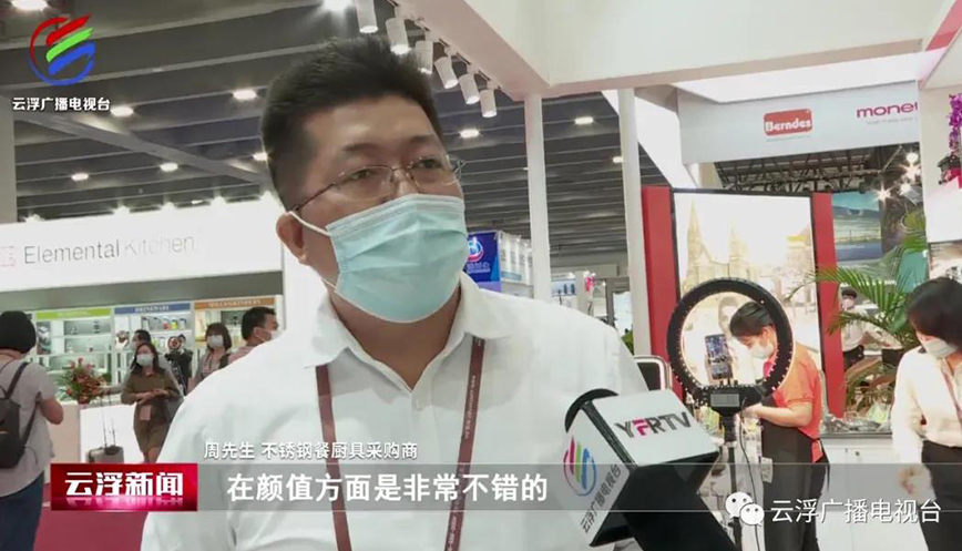 黃志榮:“這是我們最新推出的壓力鍋,它獲得了廣東第130屆進(jìn)出口產(chǎn)品的設(shè)計(jì)獎金獎,是云浮市唯一獲得金獎的產(chǎn)品,主要有幾個特點(diǎn):一是它有六重的安全裝置,第二是它可以節(jié)省百分之三十的能源。這次我們總共帶來了200到300款產(chǎn)品,主要以不銹鋼的餐廚具為主,還有鋁制的烘培類的產(chǎn)品和小家電,著力打造一個餐廚用品的一站式采購基地?!?